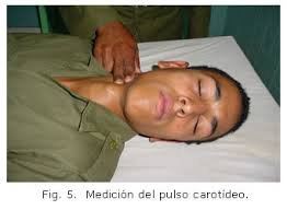 - PULSO ARTERIAL: Se buscará a la altura de las arterias carótidas, situadas a ambos lados de la línea media del cuello. El auxiliador procederá de la forma siguiente: